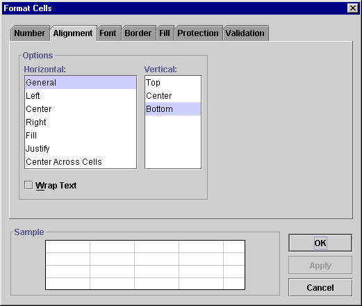 - Select Format > Cells and select the Alignment tab, shown below.