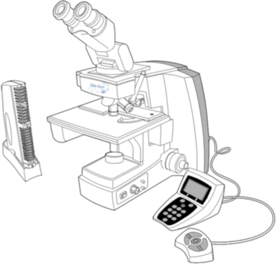 The Imaging Processor acquires and processes image data from the slides to identify diagnostically relevant cells or cell groups based on an imaging algorithm that considers cellular features and nuclear darkness. During slide imaging, the alphanumeric slide accession identifier is recorded and the x and y coordinates of 22 fields of interest are stored in the computer database. This computer also coordinates the communication of information between the Image Processor and the Review Scopes.