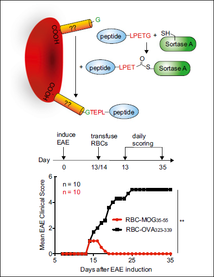 Current therapies for autoimmune diseases rely on traditional immunosuppressive medications that expose patients to an increased risk of opportunistic infections and other complications. Immunoregulatory interventions that act prophylactically or therapeutically to induce antigen-specific tolerance might overcome these obstacles. Here we use the transpeptidase sortase to covalently attach diseaseassociated autoantigens to genetically engineered and to unmodified red blood cells as a means of inducing antigen-specific tolerance. This approach blunts the contribution to immunity of major subsets of immune effector cells (B cells, CD4+ and CD8+ T cells) in an antigenspecific manner. Transfusion of red blood cells expressing self-antigen epitopes can alleviate and even prevent signs of disease in experimental autoimmune encephalomyelitis, as well as maintain normoglycemia in a mouse model of type 1 diabetes.