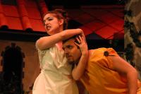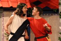 Hysterium (Daniel Perez '10) get a little more grovelling in before his masters Senex (Greg Lohman G) and Domina (Elvie Stephanopoulos '07) leave for her mothers. (credit: Jax Kirtley) Marcus Lycus (Bill Andrews '06) and his staff (Milo Martinez '08, Armen Babikyan, and Nicole O'Keefe '09) get ready to show Pseudolus (Tim Abrahamsen '06) his inventory. (credit: Jax Kirtley) Young lovers Hero (Yonatan Arie Gray '10) and Philia (Kathleen McEnnis '07) are interrupted by Slave-in-Chief, Hysterium (Daniel Perez '10). (credit: Jax Kirtley) Erronius (Steven Flowers '06) is kept from his house by Hysterium (Daniel Perez '10). (credit: Jax Kirtley) The courtesans (Janet Lieberman '07, Tara Jewett, Shannon Nees '07, Aparna Ramanathan '07, Sarah Slotznick '09, and Theresa Eugenio '07) strike a professional pose. (credit: Jax Kirtley) Domina (Elvie Stephanopoulos '07) explains to Hysterium (Daniel Perez '10) her feelings for her husband. (credit: Jax Kirtley) Pseudolus (Tim Abrahamsen '06) get Hysterium (Daniel Perez '10) all dolled up for the captain. (credit: Jax Kirtley) |