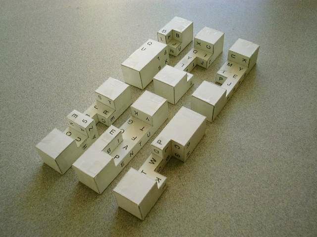 Once cut out and assembled, the 6 shapes form pieces of a 6-piece burr puzzle. The pieces fit together in only one way. Once the burr is solved, the message "BRING 2 HUNT HEADQUARTERS" is easily read.