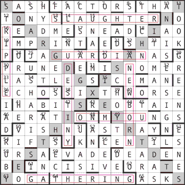 The grid may be completed as shown below. For a detailed explanation of the cryptic clues, click here. One diagonal reads YES, THIS X IS A HINT.