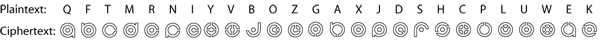 As a solving aid, each letter is shown exactly once in its correct orientation, in maroon. The list decrypts into a series of clues, each of which suggests an answer in the form of "N°". Within each clue, exactly two encrypted letters have been rotated N° counterclockwise. Clues, answers, and relevant letters are: