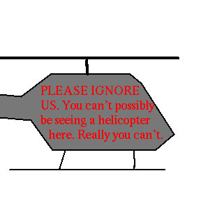 The helicopter was silent. (no sound) It was also almost impossible to see. When people walked into it, they would say "Hey, I didn't see that helicopter that I just smashed into". Especially when it was flying. People never look up.