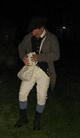 Having acquired an excellent viewing spot, we settled down to wait the 45 minutes or so in the cold and dark until things started happening. During this period of time some of the townspeople and minutemen spent time milling around the common in small groups. When we first got there, we saw a couple minutemen wander by asking if thre were pickeys yet. Gradually more people appeared, including women carrying candle lanterns. One minueman in green kept wandering and telling people "Don't worry the heat will be one soon." At this point, Captain Parker and some of the militia are waiting across the green in Buckman's Tavern for word from their scouts of the impending arrival of the British. At this point, it's still pretty dark and kind of cold. Wiser spectators had brought blankets and chairs. And hot drinks. The only way I could frame pictures on my digital camera was by observing where my subjects were in relation to the electric lights, which were the only things that showed up on my viewfinder.