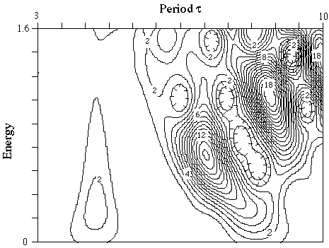This graph, instead of yielding a set of lines describing the families of periodic orbits as is the case with the classical plot, gives a contour graph or a 3-dimensional surface plot. In the limit as Planck's constant, h, goes to zero, this contour plot yields the classical plot (being non-zero only on the classical periodic orbits). However, for non-zero h, one sees interference effects between the "orbits." Below is a sample quantal E-Tau plot (this one is for the Nelson Hamiltonian):