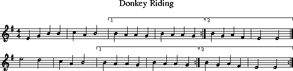 %%pageheight 11in %%stretchlast no X:1 T:Donkey Riding R:hornpipe H:Used for the Hounds dance "Northern Star" H:Tune is the same as used for the Bledington-style dance H: composed by the Binghamton Morris Men M:4/4 L:1/4 Q:1/4=132 K:G %%partsfont Times-Bold 16.0 %%MIDI channel 1 %%MIDI control 7 50 % volume = 50 %%MIDI program 41 % General MIDI violin %%MIDI transpose 0 %%MIDI gchordoff P:A E G B B | c A B2 |1 B A A G | B A A G :|2 B G A F | E2 E2 |] P:B |: e2 d2 | c A B2 | B A A G | B A A G | e2 d2 | c A B2 | B G A F | E2 E2 :|