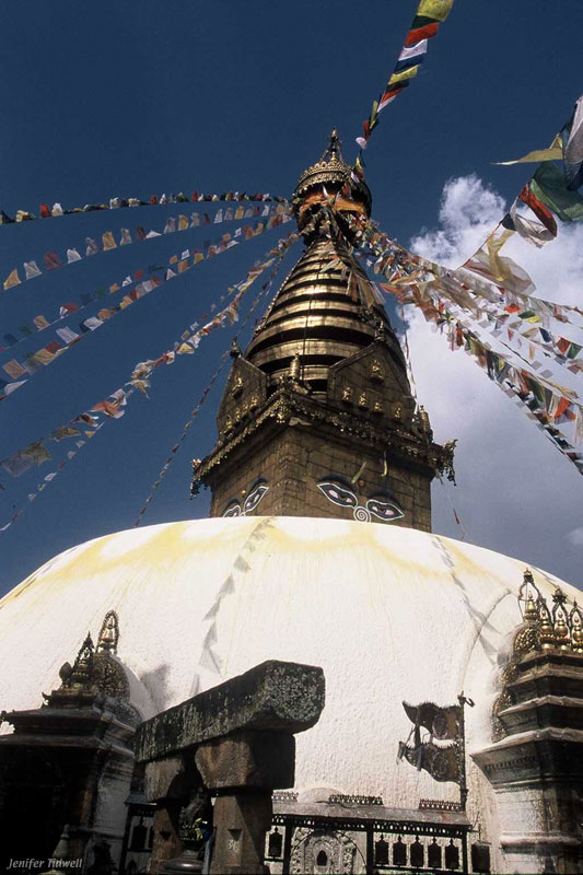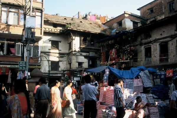 To the right is a picture of the stupa at Swayambhunath, or the "Monkey Temple." It sits at the top of a forested (and monkey-inhabited) hill on the fringes of Kathmandu. Stupas are Buddhist temples that follow a strict architectural pattern: a square footprint, a dome, a four-sided tower with the Buddha's all-seeing eyes facing the four cardinal directions, and a "crown" of sorts from which prayer flags are strung. There is nothing inside the building, as far as I know. Around larger stupas, you find rows of cylindrical prayer wheels. As devotees walk around the stupa -- always clockwise, even for tourists -- they spin the wheels. Swayambhunath, like its older and larger brother Boudhanath, has a ring of shops and residences immediately around it, plus some Hindu shrines and sacred objects. (They can't be seen in this picture.) Most of the city is made up of street-level shops, narrow streets, and the occasional surprise shrine or stupa. The picture below was taken near Indra Chowk, in one of the older parts of town. Old and new buildings mix freely; people sell stuff from every possible place, even flowers from a second-story balcony! |