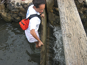 | Mahina Paishon Duarte, Executive Director of Paepae o He'eia, raises a makaha (a sluice gate) to allow seawater to come in to the fish pond |