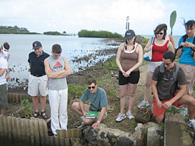 | Mahina points out sample sites on the fish pond |