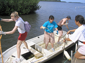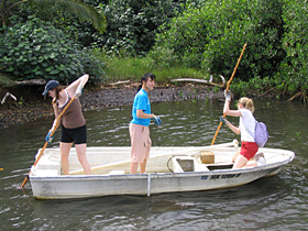 Students poling out to sample sites with equipment |