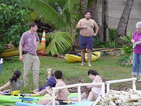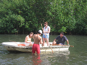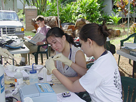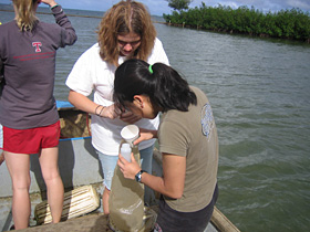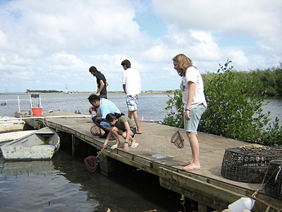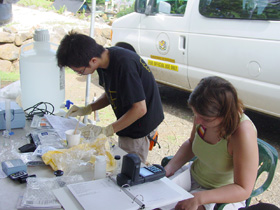 | Students prepare for salinity sampling as Donald Frankel flies overhead with the FLIR (Forward Looking InfraRed) camera for thermal imagine studies. |
