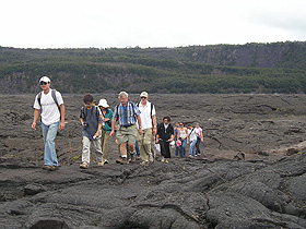 | James Besancon, Professor of Geology at Wellesley College, leads students across a crater at Mt. Kilauea |