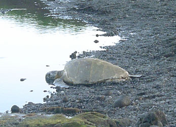 | One of Hawai'i's rare green turtles sunning itself on Punalu'u black sand beach. |