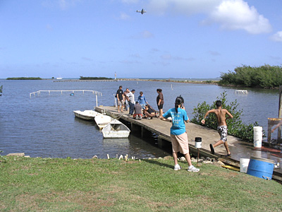 | Students prepare for salinity sampling as Donald Frankel flies overhead with the FLIR (Forward Looking InfraRed) camera for thermal imagine studies. |
