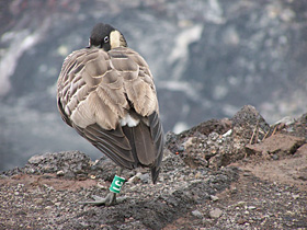 This Hawai'ian goose, Hawai'i's state bird (also referred to as a "Nene"), is endangered |