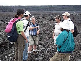 | James Besancon, Professor of Geology at Wellesley College, leads students across a crater at Mt. Kilauea |