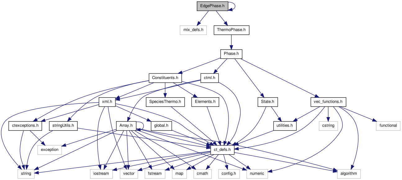 Declarations for the EdgePhase ThermoPhase object, which models the interface between two surfaces (see Thermodynamic Properties and EdgePhase). More...