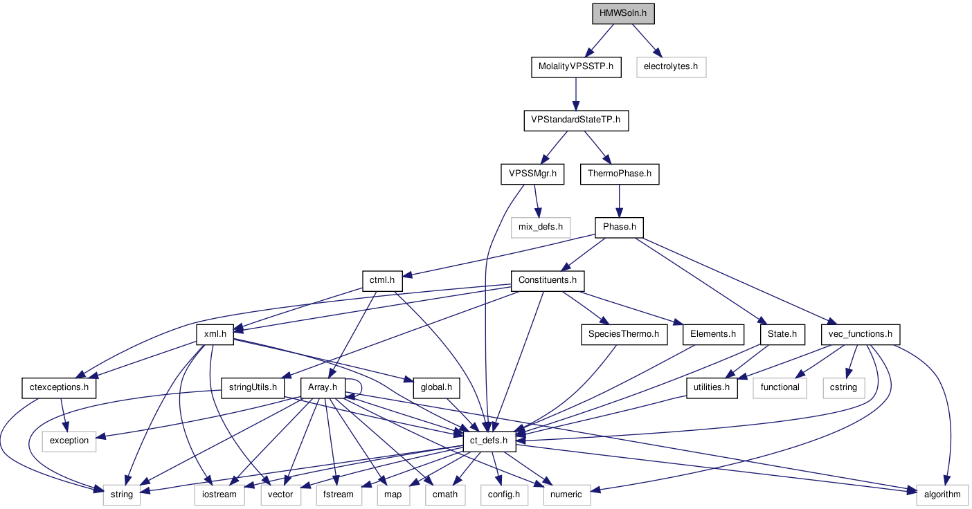 Headers for the HMWSoln ThermoPhase object, which models concentrated electrolyte solutions (see Thermodynamic Properties and HMWSoln ) .