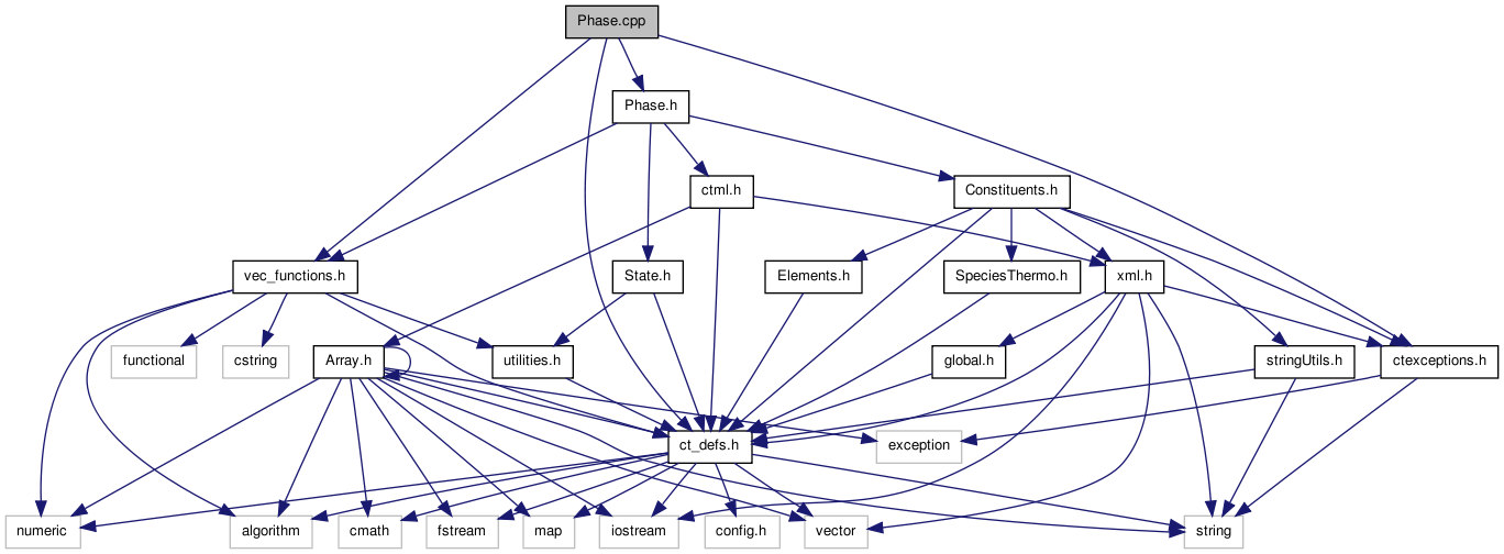 Definition file for class, Phase, which contains functions for setting the state of a phase, and for referencing species by name (see Models of Phases of Matter and class Phase). More...