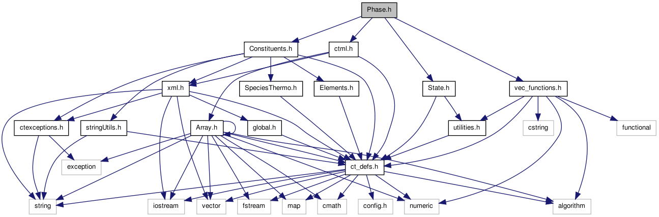 Header file for class, Phase, which contains functions for setting the state of a phase, and for referencing species by name, and also contains text for the module phases (see Models of Phases of Matter and class Phase).