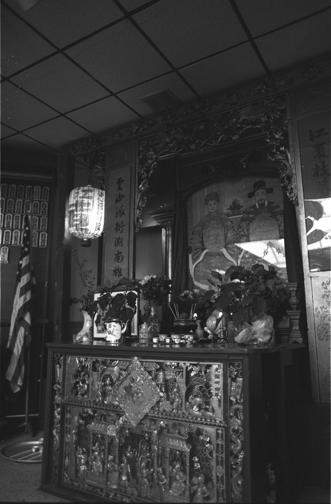 Chinese altar with ornate wood carvings.