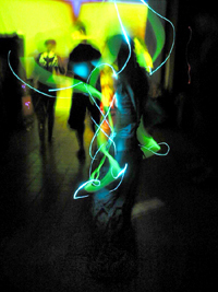 | In the same way that people traveled to Goa and produced Goa-trance, Boston Goa fans now travel to Goa-trance. At 135+ bpm, Goa is dance music. Punctuated with trippy sound and distorted samples, Goa is meant to induce a psychedelic state. Wherever they hold events, there is music, dancing, and black-lit posters. | ![]() |