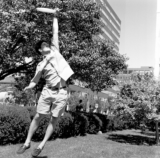 | Peter R. Russo (MIT G) leaps to catch a frisbee during an inpromptu lunchtime game of Ultimate. | |