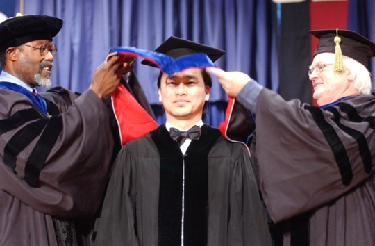 | Byong Mok Oh (MIT Ph.D. '02) receives his doctoral hood from the head of his department and the Chancellor of MIT. | |