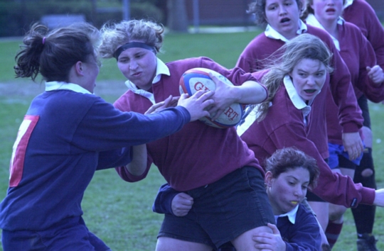 | Kristin Brodie (MIT ’03) busts through two opponents during an MIT Women's Rugby match as Elizabeth Ward (MIT ’05) and Sarah Daigh (MIT ’03) look on. | |