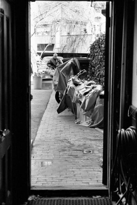 The view from my house out to the alley. A man is seen eyeing the recyclables.