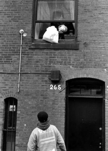 John waits beneath the window of 265 for a single bag of trash. This is a weekly occurence. Mike commented, "never fails."