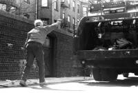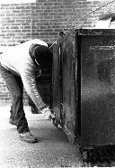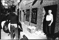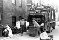 John (L) and Mike (R) dispose of Back Bay residential trash. Comparing the Back Bay to other neighborhoods, John mentions, "[the] back doors are here, nobody leaves through the back."