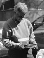 | Ralph relaxes after spending a few hours collecting cans and bottles. Sometimes he drinks a beer with others before heading into Cambridge to exchange the cans.