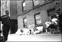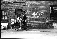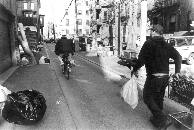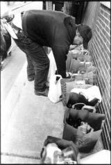 | Flaco, not wishing to be photographed, briskly looks for cans. "Sometimes [the residents] give me a hard time...[so] I walk fast." He prefers to do this alone, saying in Spanish, "Soy solamente yo," which translates to "I am only with myself."