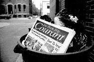 | A copy of the neighborhood weekly newspaper peeks out of a full container.