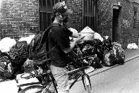 Vinnie prepares to head home on his bike. Many people run a mini-business from the trash.