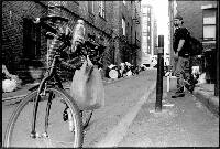 Ralph is passed by a man on a bike. People traverse the alleys in search of different things.