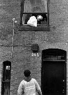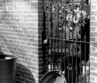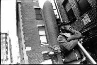 John waits beneath the window of 265 for a single bag of trash. This is a weekly occurence. Mike commented, "never fails." |