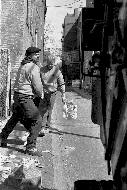Kevin (L) and Ralph (R) relax after their day is ending. It is approximately 10:30 am. Most of the cans have been retrieved, and the garbage truck is closing in from down the alley.