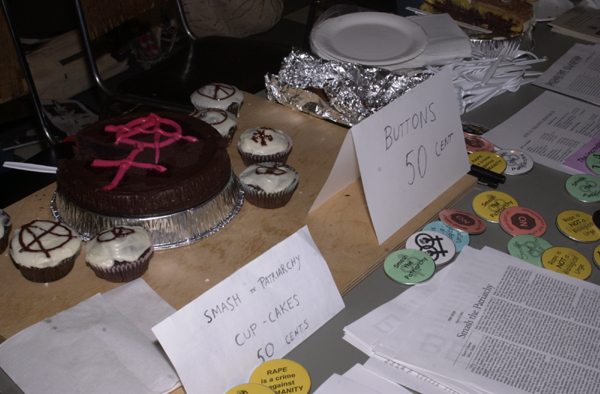 | Along with a flesh-colored counterpart, the paper-mache pinata was part of the Smash the Patriarchy Bake Sale, held on International Women's Day. Those who stopped by the bake-sale table could stock up on anarcho-feminist baked goods, buttons, and assorted hand-outs and flyers. Among these was a sheet explaining the idealogical significance of the pinata: by smashing it, "people are symbolically taking aim at an unfair, violent, and destructive power structure." |