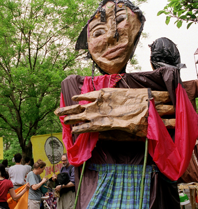 The march was a study in visual contrasts, from the giant puppets of the anti-globalization protesters...