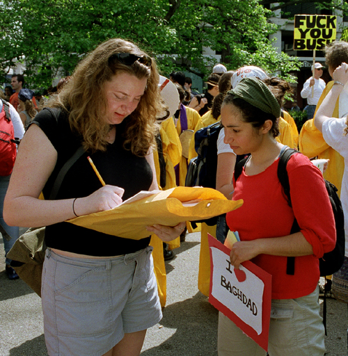 MIT, and I hated George Bush." Going to large events like protests reassures her that she is not alone in all of her views. "Events like protests are to be assured that there is a community that on some level shares an ideology." Soraya (right) shows her opposition to US invasion of Iraq at a rally outside the World Bank building in Washington, DC. |