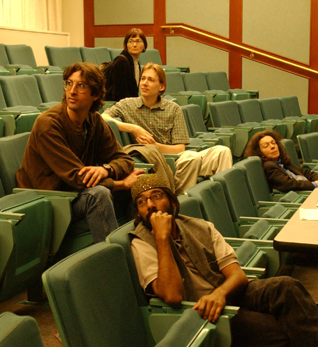 ![]() Students listen to discussion following a movie in the "Whose Global Economy?" movie series. |