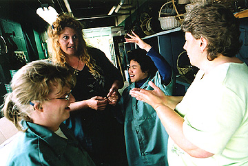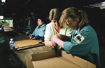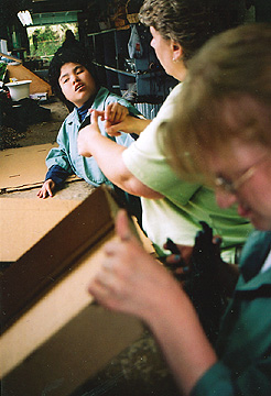 explains to Monica, 18, through sign language, how to fold the boxes. Since
