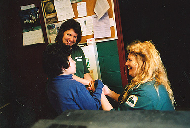 Monica reads her motions by holding onto her hands. After finishing her work