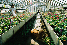 [Maurene Simonelli, the Greenhouse Manager, waters while Ziggy waits.]