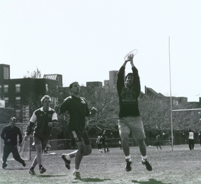 | On Sunday morning at the early hour of noon, Brian, captain of ZBT's ultimate Frisbee team, is systemically going around the house and waking up the other members of his team. Some people roll over and just fall back asleep. Other people haul themselves out of bed and into athletic clothes. Finally, Brian gets most of his team assembled and onto the van. |