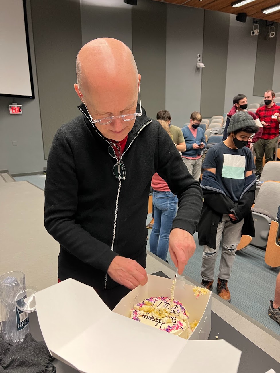 Bill's Birthday Bash 2022!February 14th, 2022 Room 26-100 Dr. William Cutter, conductor The officers wanted to make Bill's last birthday with the choir a special experience. The department helped us get three cakes from Flour Bakery, and the choir got Bill a "Pi" shirt, some Flour cookbooks, and a fun Flour spatula. |