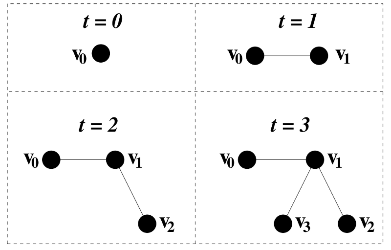 As the last example just showed, our model needs to take in count the possibility of adding new nodes and new conecctions as well as the elimination of previously present connections and nodes. In the simplest model of network growth, que can add a new node in each time step. This new node can be connected with any previously present node. Then, the probability of each node of being selected is , where